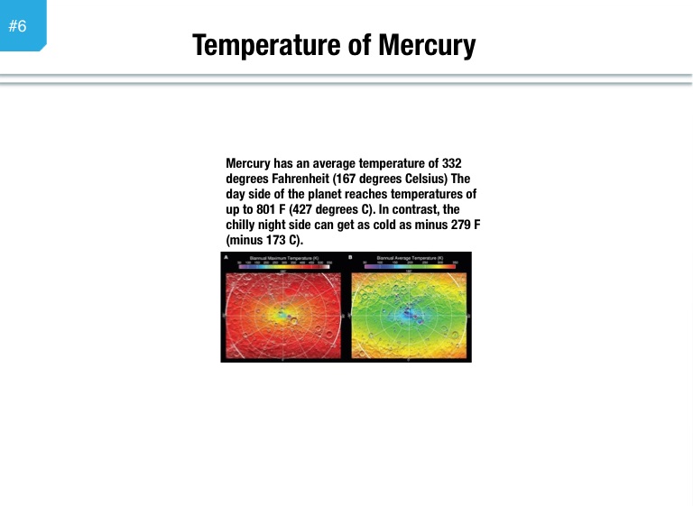 Mercury has an average temperature of 332 degrees Fahrenheit (167 degrees Celsius) The day side of the planet reaches temperatures of up to 801 F (427 degrees C). In contrast, the chilly night side can get as cold as minus 279 F (minus 173 C).