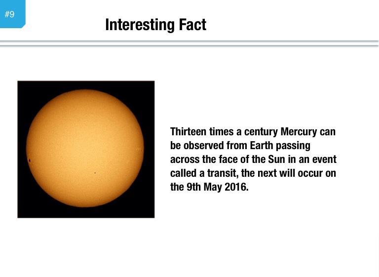 Thirteen times a century Mercury can be observed from Earth passing across the face of the Sun in an event called a transit, the next will occur on the 9th May 2016.