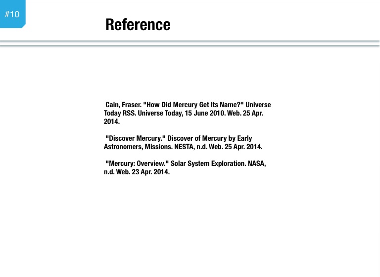 Cain, Fraser. "How Did Mercury Get Its Name?" Universe Today RSS. Universe Today, 15 June 2010. Web. 25 Apr. 2014.
