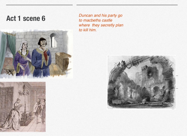 Duncan and his party go to macbeths castle where they secretly plan to kill him.