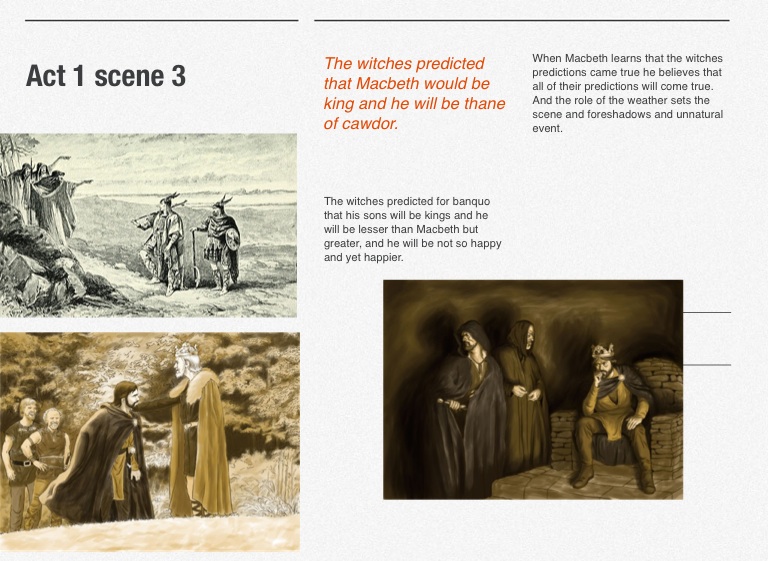 When Macbeth learns that the witches predictions came true he believes that all of their predictions will come true. And the role of the weather sets the scene and foreshadows and unnatural event.