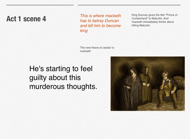 King Duncan gives the title "Prince of Cumberland" to Malcolm. And macbeth immediately thinks about killing Malcolm.