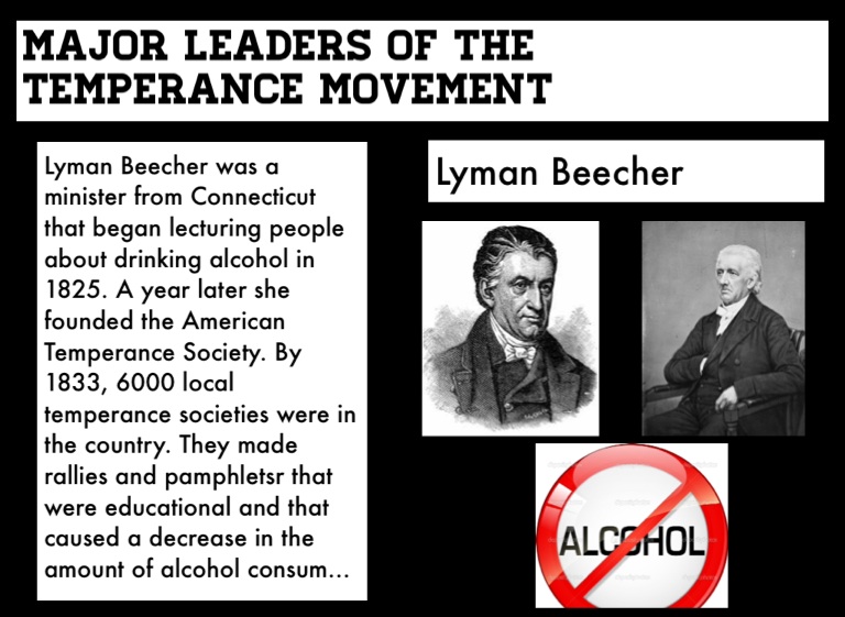 Lyman Beecher was a minister from Connecticut that began lecturing people about drinking alcohol in 1825. A year later she founded the American Temperance Society. By 1833, 6000 local temperance societies were in the country. They made rallies and pamphletsr that were educational and that caused a decrease in the amount of alcohol consumed.