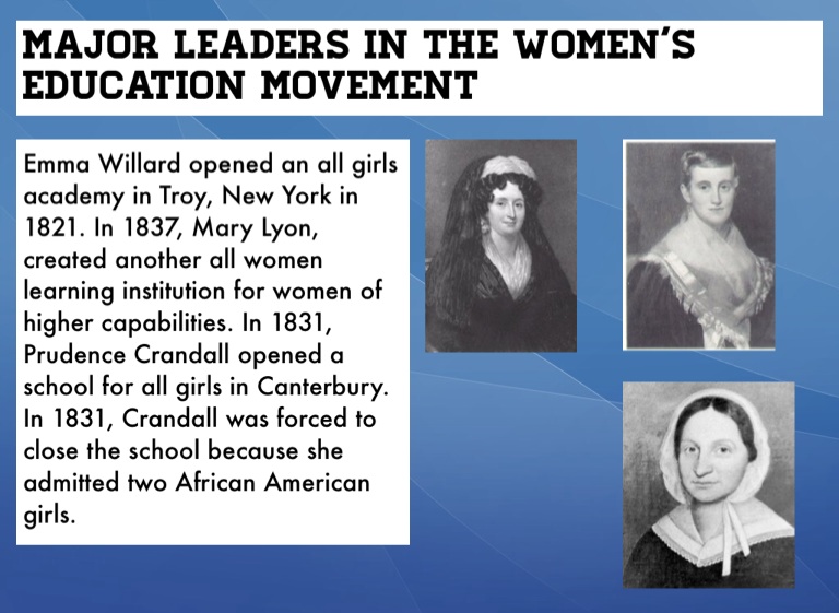 Emma Willard opened an all girls academy in Troy, New York in 1821. In 1837, Mary Lyon, created another all women learning institution for women of higher capabilities. In 1831, Prudence Crandall opened a school for all girls in Canterbury. In 1831, Crandall was forced to close the school because she admitted two African American girls.