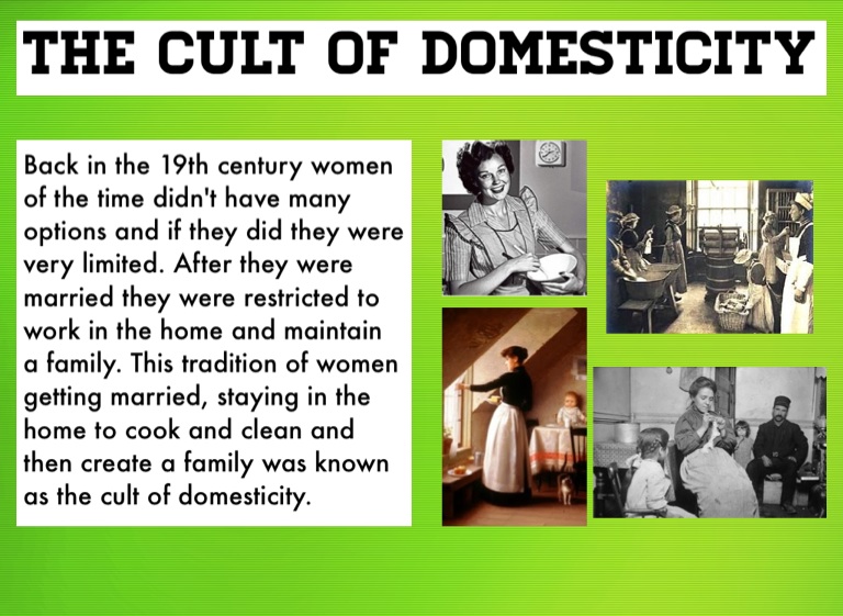 Back in the 19th century women of the time didn't have many options and if they did they were very limited. After they were married they were restricted to work in the home and maintain a family. This tradition of women getting married, staying in the home to cook and clean and then create a family was known as the cult of domesticity.