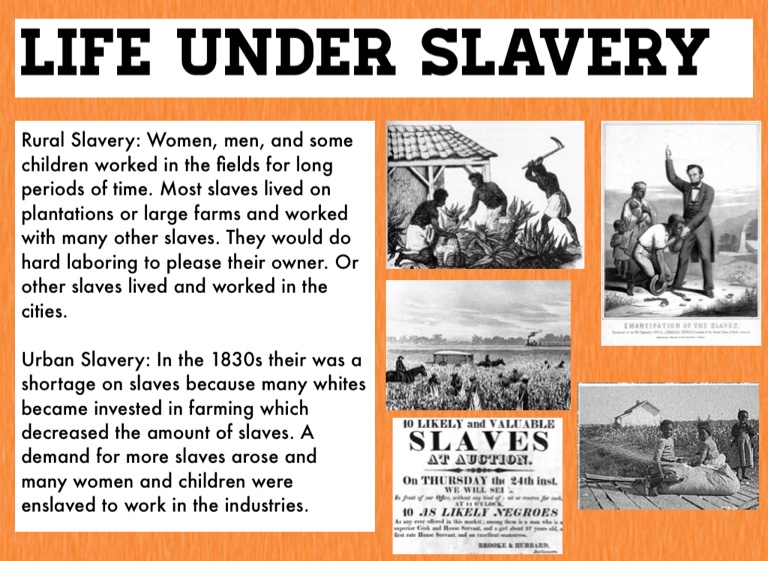 Rural Slavery: Women, men, and some children worked in the fields for long periods of time. Most slaves lived on plantations or large farms and worked with many other slaves. They would do hard laboring to please their owner. Or other slaves lived and worked in the cities.