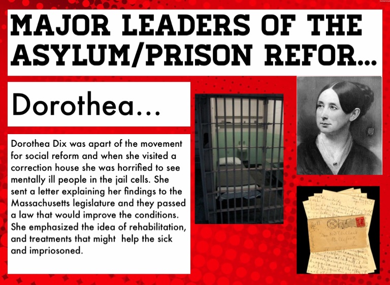 Dorothea Dix was apart of the movement for social reform and when she visited a correction house she was horrified to see mentally ill people in the jail cells. She sent a letter explaining her findings to the Massachusetts legislature and they passed a law that would improve the conditions. She emphasized the idea of rehabilitation, and treatments that might help the sick and impriosoned.
