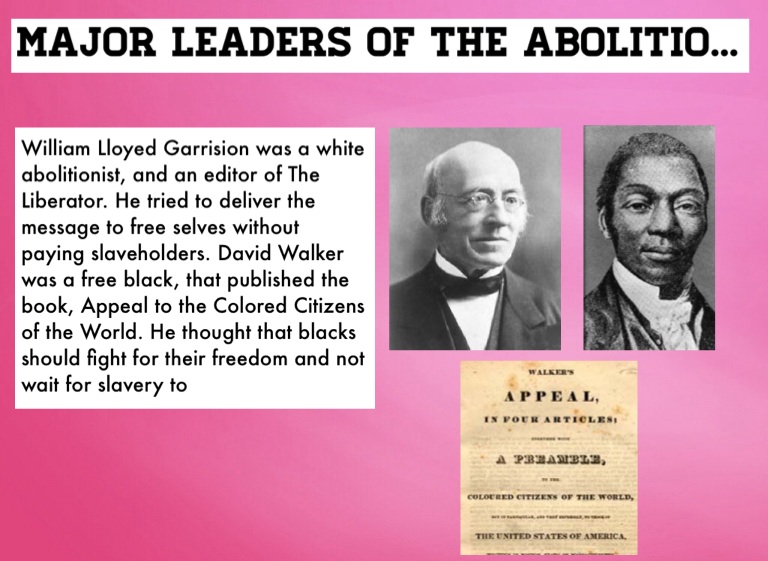 William Lloyed Garrision was a white abolitionist, and an editor of The Liberator. He tried to deliver the message to free selves without paying slaveholders. David Walker was a free black, that published the book, Appeal to the Colored Citizens of the World. He thought that blacks should fight for their freedom and not wait for slavery to