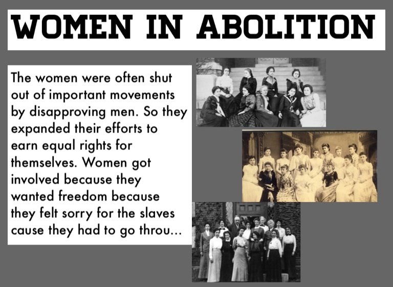The women were often shut out of important movements by disapproving men. So they expanded their efforts to earn equal rights for themselves. Women got involved because they wanted freedom because they felt sorry for the slaves cause they had to go through the same thing.