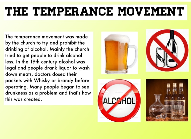 The temperance movement was made by the church to try and prohibit the drinking of alcohol. Mainly the church tried to get people to drink alcohol less. In the 19th century alcohol was legal and people drank liquor to wash down meats, doctors dosed their packets with Whisky or brandy before operating. Many people began to see drunkness as a problem and that's how this was created.