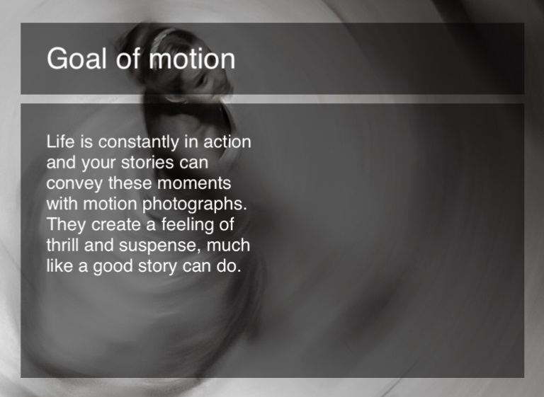 Life is constantly in action and your stories can convey these moments with motion photographs. They create a feeling of thrill and suspense, much like a good story can do.