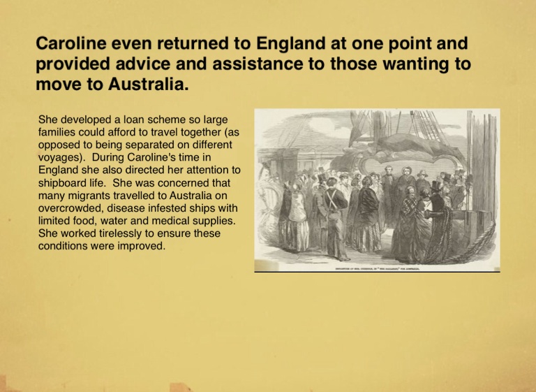 She developed a loan scheme so large families could afford to travel together (as opposed to being separated on different voyages). During Caroline's time in England she also directed her attention to shipboard life. She was concerned that many migrants travelled to Australia on overcrowded, disease infested ships with limited food, water and medical supplies. She worked tirelessly to ensure these conditions were improved.