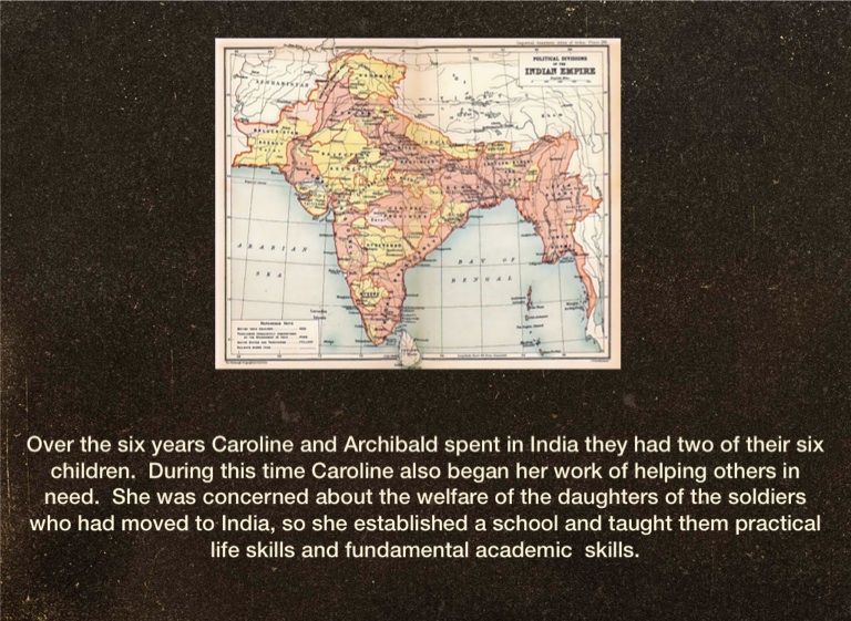 Over the six years Caroline and Archibald spent in India they had two of their six children. During this time Caroline also began her work of helping others in need. She was concerned about the welfare of the daughters of the soldiers who had moved to India, so she established a school and taught them practical life skills and fundamental academic skills.