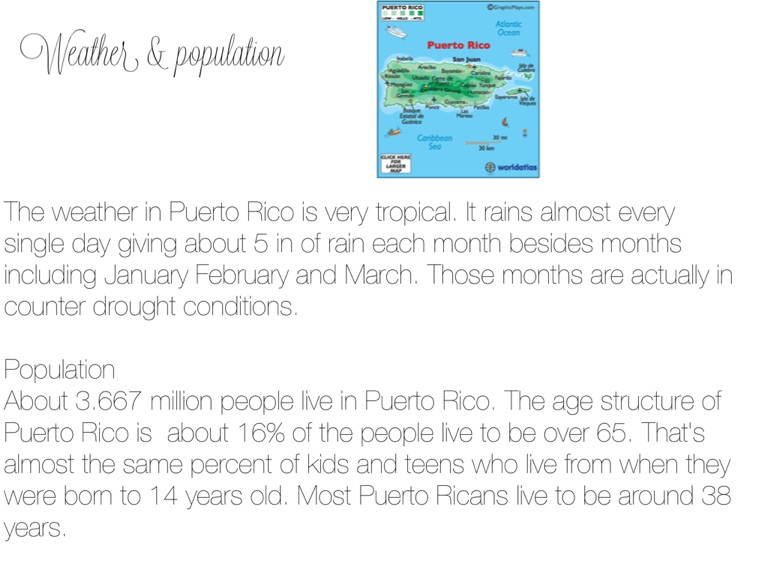 The weather in Puerto Rico is very tropical. It rains almost every single day giving about 5 in of rain each month besides months including January February and March. Those months are actually in counter drought conditions.