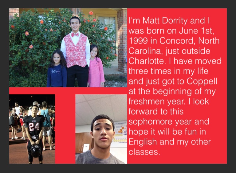 I'm Matt Dorrity and I was born on June 1st, 1999 in Concord, North Carolina, just outside Charlotte. I have moved three times in my life and just got to Coppell at the beginning of my freshmen year. I look forward to this sophomore year and hope it will be fun in English and my other classes.