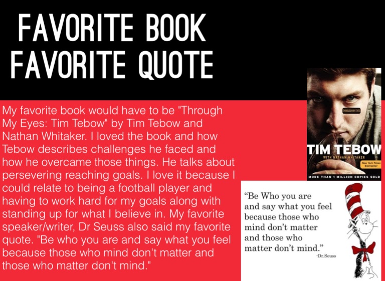 My favorite book would have to be "Through My Eyes: Tim Tebow" by Tim Tebow and Nathan Whitaker. I loved the book and how Tebow describes challenges he faced and how he overcame those things. He talks about persevering reaching goals. I love it because I could relate to being a football player and having to work hard for my goals along with standing up for what I believe in. My favorite speaker/writer, Dr Seuss also said my favorite quote. "Be who you are and say what you feel because those who mind don't matter and those who matter don't mind."