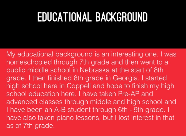 My educational background is an interesting one. I was homeschooled through 7th grade and then went to a public middle school in Nebraska at the start of 8th grade. I then finished 8th grade in Georgia. I started high school here in Coppell and hope to finish my high school education here. I have taken Pre-AP and advanced classes through middle and high school and I have been an A-B student through 6th - 9th grade. I have also taken piano lessons, but I lost interest in that as of 7th grade.