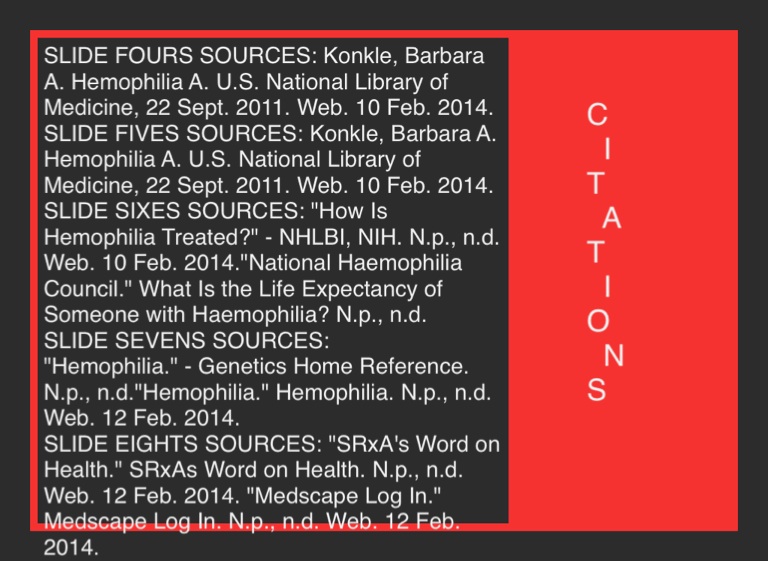 "Hemophilia." - Genetics Home Reference. N.p., n.d."Hemophilia." Hemophilia. N.p., n.d. Web. 12 Feb. 2014.