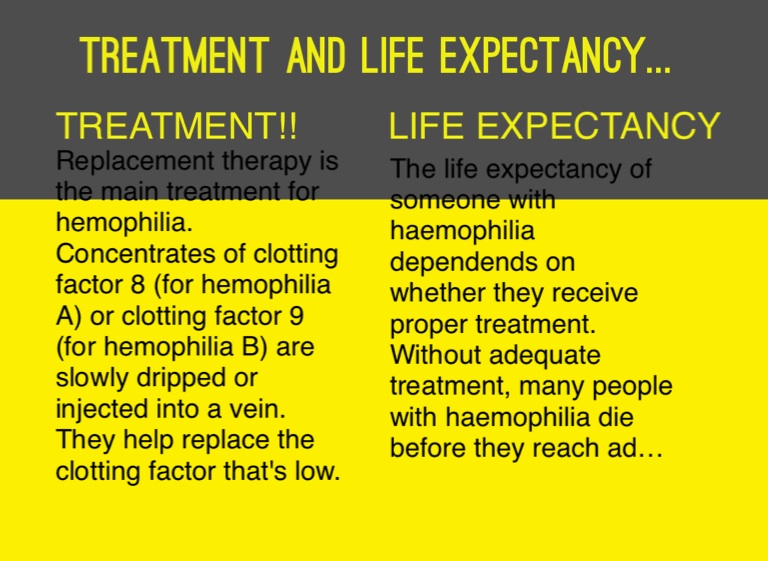 The life expectancy of someone with haemophilia dependends on whether they receive proper treatment. Without adequate treatment, many people with haemophilia die before they reach adulthood.