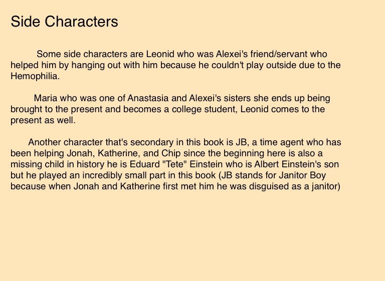 Some side characters are Leonid who was Alexei's friend/servant who helped him by hanging out with him because he couldn't play outside due to the Hemophilia.