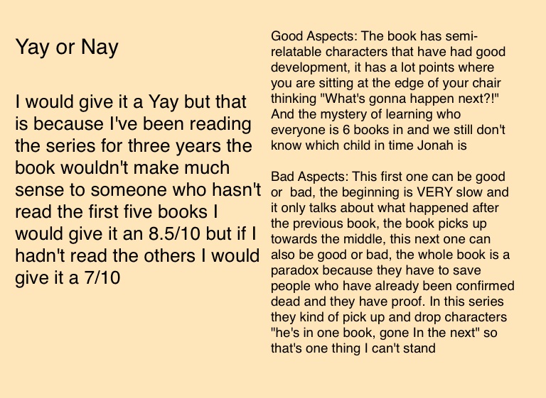 Good Aspects: The book has semi-relatable characters that have had good development, it has a lot points where you are sitting at the edge of your chair thinking "What's gonna happen next?!" And the mystery of learning who everyone is 6 books in and we still don't know which child in time Jonah is