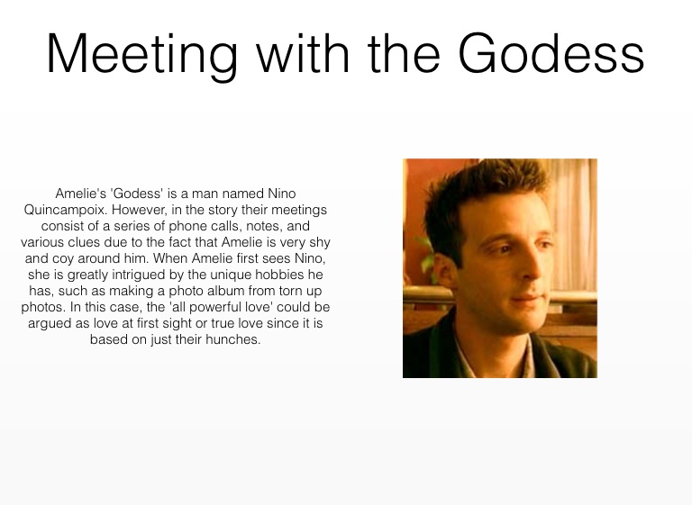 Amelie's 'Godess' is a man named Nino Quincampoix. However, in the story their meetings consist of a series of phone calls, notes, and various clues due to the fact that Amelie is very shy and coy around him. When Amelie first sees Nino, she is greatly intrigued by the unique hobbies he has, such as making a photo album from torn up photos. In this case, the 'all powerful love' could be argued as love at first sight or true love since it is based on just their hunches.