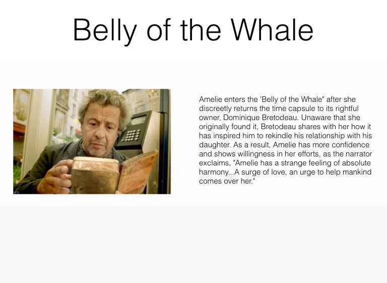 Amelie enters the 'Belly of the Whale" after she discreetly returns the time capsule to its rightful owner, Dominique Bretodeau. Unaware that she originally found it, Bretodeau shares with her how it has inspired him to rekindle his relationship with his daughter. As a result, Amelie has more confidence and shows willingness in her efforts, as the narrator exclaims, "Amelie has a strange feeling of absolute harmony...A surge of love, an urge to help mankind comes over her."