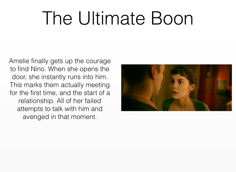 Amelie finally gets up the courage to find Nino. When she opens the door, she instantly runs into him. This marks them actually meeting for the first time, and the start of a relationship. All of her failed attempts to talk with him and avenged in that moment.