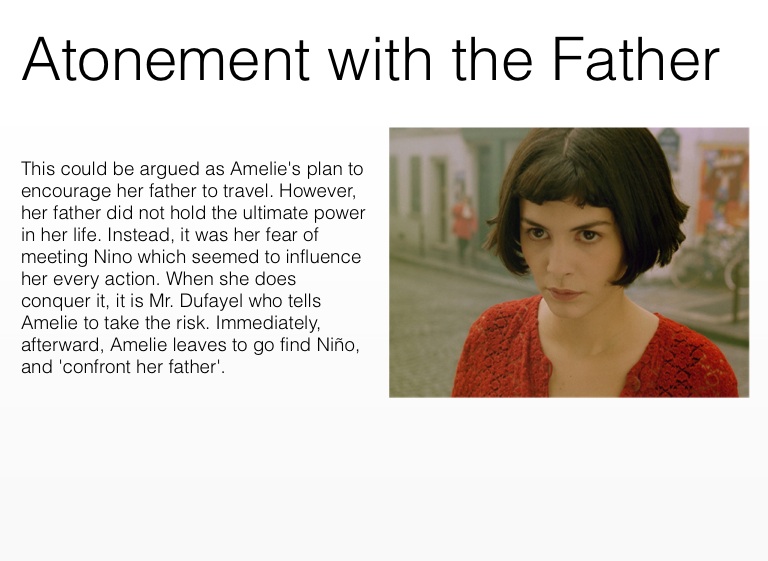 This could be argued as Amelie's plan to encourage her father to travel. However, her father did not hold the ultimate power in her life. Instead, it was her fear of meeting Nino which seemed to influence her every action. When she does conquer it, it is Mr. Dufayel who tells Amelie to take the risk. Immediately, afterward, Amelie leaves to go find NiƱo, and 'confront her father'.