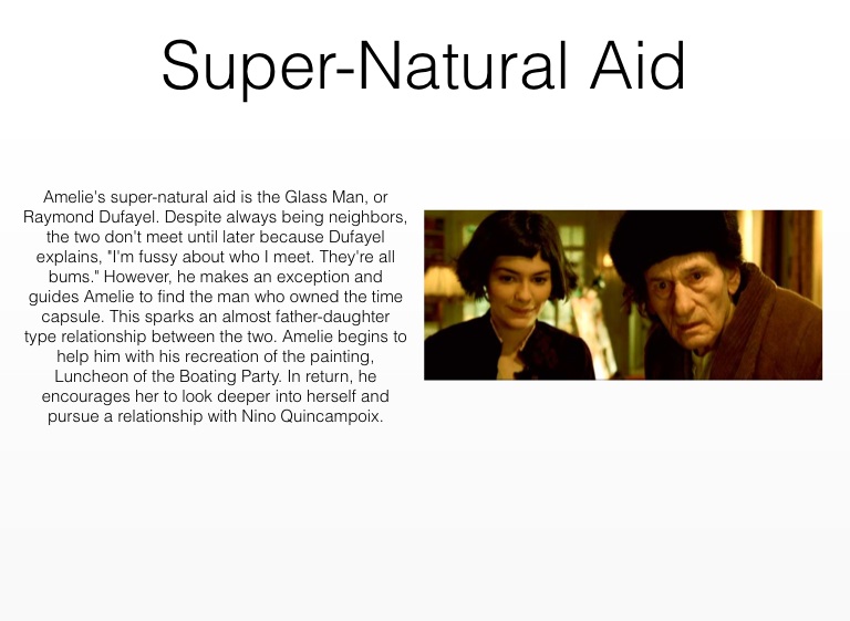 Amelie's super-natural aid is the Glass Man, or Raymond Dufayel. Despite always being neighbors, the two don't meet until later because Dufayel explains, "I'm fussy about who I meet. They're all bums." However, he makes an exception and guides Amelie to find the man who owned the time capsule. This sparks an almost father-daughter type relationship between the two. Amelie begins to help him with his recreation of the painting, Luncheon of the Boating Party. In return, he encourages her to look deeper into herself and pursue a relationship with Nino Quincampoix.