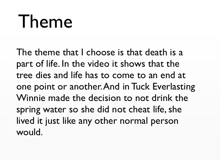 The theme that I choose is that death is a part of life. In the video it shows that the tree dies and life has to come to an end at one point or another. And in Tuck Everlasting Winnie made the decision to not drink the spring water so she did not cheat life, she lived it just like any other normal person would.