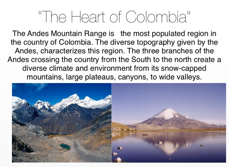 The Andes Mountain Range is the most populated region in the country of Colombia. The diverse topography given by the Andes, characterizes this region. The three branches of the Andes crossing the country from the South to the north create a diverse climate and environment from its snow-capped mountains, large plateaus, canyons, to wide valleys.