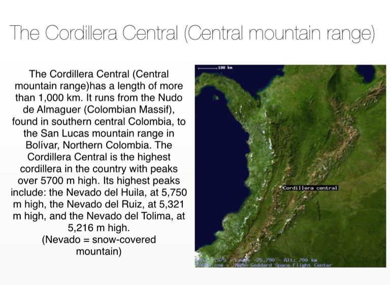 The Cordillera Central (Central mountain range)has a length of more than 1,000 km. It runs from the Nudo de Almaguer (Colombian Massif), found in southern central Colombia, to the San Lucas mountain range in BolĂvar, Northern Colombia. The Cordillera Central is the highest cordillera in the country with peaks over 5700 m high. Its highest peaks include: the Nevado del Huila, at 5,750 m high, the Nevado del Ruiz, at 5,321 m high, and the Nevado del Tolima, at 5,216 m high.