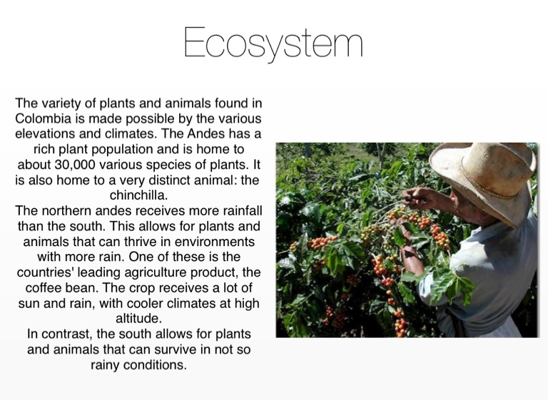 The northern andes receives more rainfall than the south. This allows for plants and animals that can thrive in environments with more rain. One of these is the countries' leading agriculture product, the coffee bean. The crop receives a lot of sun and rain, with cooler climates at high altitude.