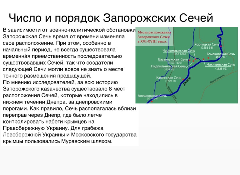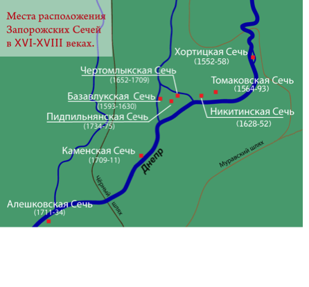 По мнению исследователей, за всю историю Запорожского казачества существовало 8 мест расположения Сечей, которые находились в нижнем течении Днепра, за днепровскими порогами. Как правило, Сечь располагалась вблизи переправ через Днепр, где было легче контролировать набеги крымцев на Правобережную Украину. Для грабежа Левобережной Украины и Московского государства крымцы пользовались Муравским шляхом.