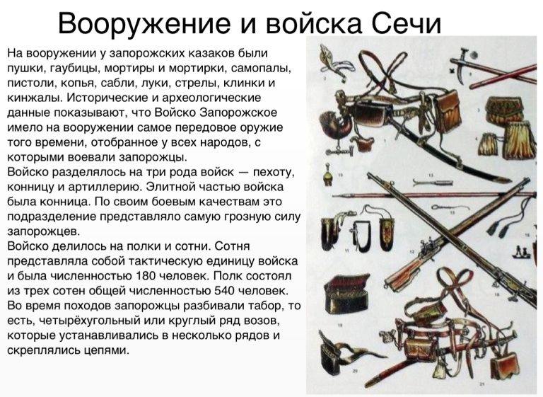 На вооружении у запорожских казаков были пушки, гаубицы, мортиры и мортирки, самопалы, пистоли, копья, сабли, луки, стрелы, клинки и кинжалы. Исторические и археологические данные показывают, что Войско Запорожское имело на вооружении самое передовое оружие того времени, отобранное у всех народов, с которыми воевали запорожцы.