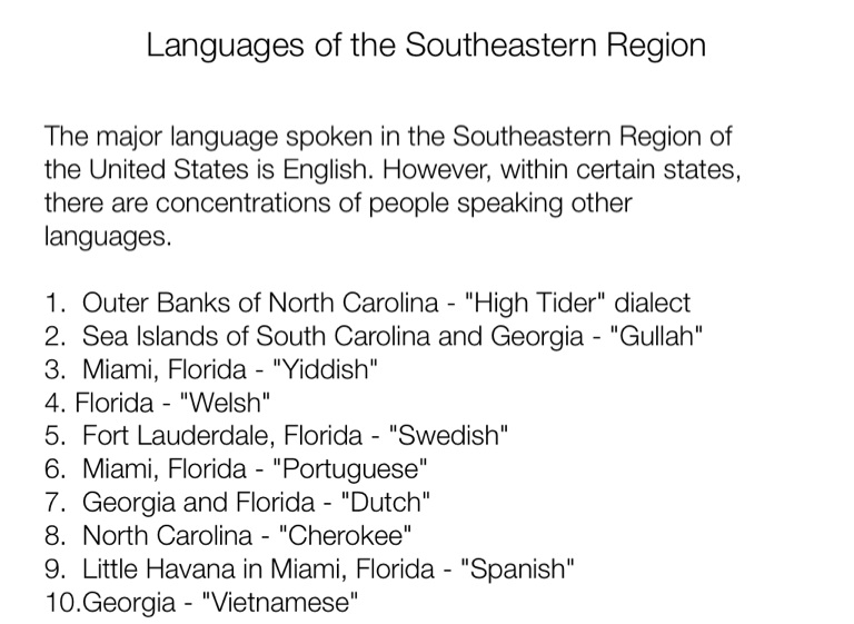 The major language spoken in the Southeastern Region of the United States is English. However, within certain states, there are concentrations of people speaking other languages.
