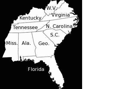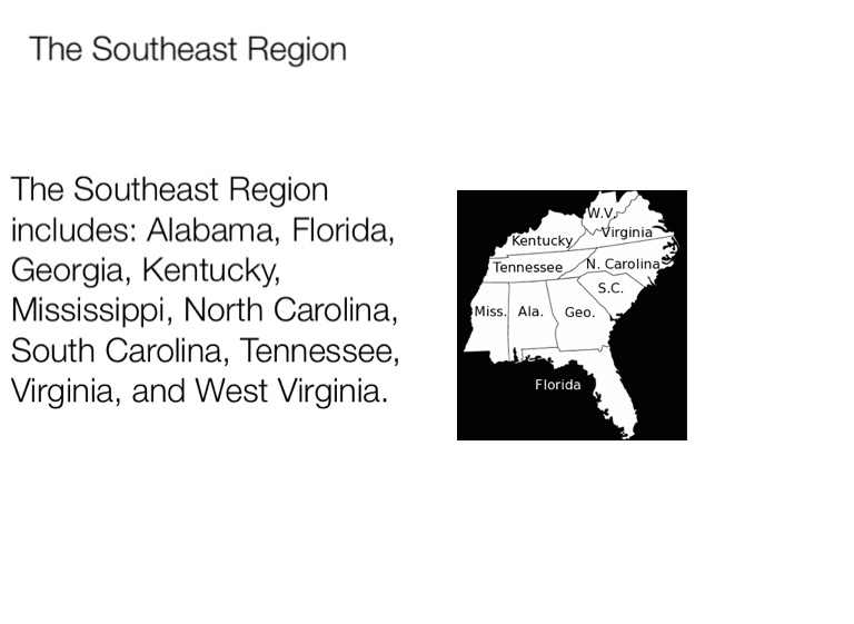 The Southeast Region includes: Alabama, Florida, Georgia, Kentucky, Mississippi, North Carolina, South Carolina, Tennessee, Virginia, and West Virginia.