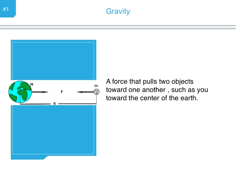 A force that pulls two objects toward one another , such as you toward the center of the earth.