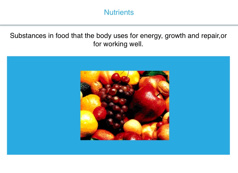 Substances in food that the body uses for energy, growth and repair,or for working well.