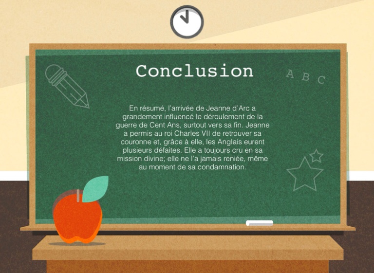 En résumé, l’arrivée de Jeanne d’Arc a grandement influencé le déroulement de la guerre de Cent Ans, surtout vers sa fin. Jeanne a permis au roi Charles VII de retrouver sa couronne et, grâce à elle, les Anglais eurent plusieurs défaites. Elle a toujours cru en sa mission divine; elle ne l’a jamais reniée, même au moment de sa condamnation.