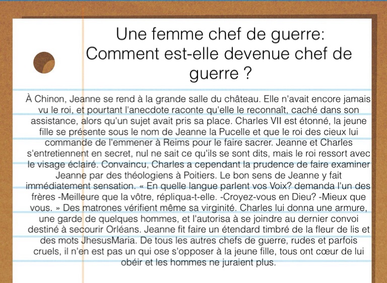 À Chinon, Jeanne se rend à la grande salle du château. Elle n'avait encore jamais vu le roi, et pourtant l'anecdote raconte qu'elle le reconnaît, caché dans son assistance, alors qu'un sujet avait pris sa place. Charles VII est étonné, la jeune fille se présente sous le nom de Jeanne la Pucelle et que le roi des cieux lui commande de l'emmener à Reims pour le faire sacrer. Jeanne et Charles s'entretiennent en secret, nul ne sait ce qu'ils se sont dits, mais le roi ressort avec le visage éclairé. Convaincu, Charles a cependant la prudence de faire examiner Jeanne par des théologiens à Poitiers. Le bon sens de Jeanne y fait immédiatement sensation. « En quelle langue parlent vos Voix? demanda l'un des frères -Meilleure que la vôtre, répliqua-t-elle. -Croyez-vous en Dieu? -Mieux que vous. » Des matrones vérifient même sa virginité. Charles lui donna une armure, une garde de quelques hommes, et l'autorisa à se joindre au dernier convoi destiné à secourir Orléans. Jeanne fit faire un étendard timbré de la fleur de lis et des mots JhesusMaria. De tous les autres chefs de guerre, rudes et parfois cruels, il n'en est pas un qui ose s'opposer à la jeune fille, tous ont cœur de lui obéir et les hommes ne juraient plus.