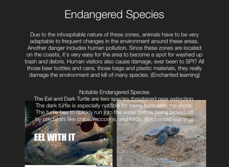 Due to the inhospitable nature of these zones, animals have to be very adaptable to frequent changes in the environment around these areas. Another danger includes human pollution. Since these zones are located on the coasts, it's very easy for the area to become a spot for washed up trash and debris. Human visitors also cause damage, ever been to SPI? All those beer bottles and cans, those bags and plastic materials, they really damage the environment and kill of many species. (Enchanted learning)