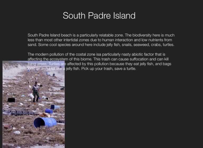 South Padre Island beach is a particularly relatable zone. The biodiversity here is much less than most other intertidal zones due to human interaction and low nutrients from sand. Some cool species around here include jelly fish, snails, seaweed, crabs, turtles.