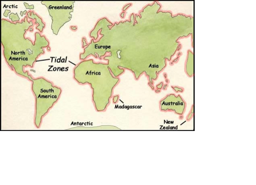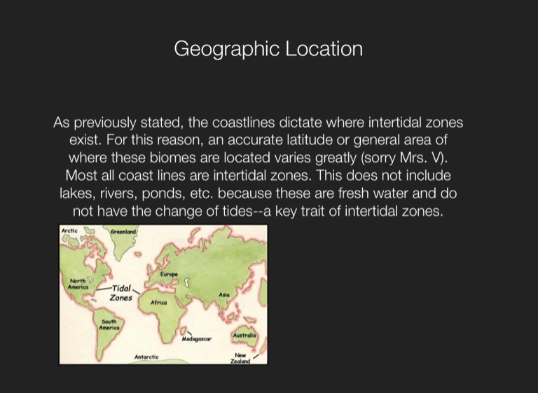 As previously stated, the coastlines dictate where intertidal zones exist. For this reason, an accurate latitude or general area of where these biomes are located varies greatly (sorry Mrs. V). Most all coast lines are intertidal zones. This does not include lakes, rivers, ponds, etc. because these are fresh water and do not have the change of tides--a key trait of intertidal zones.