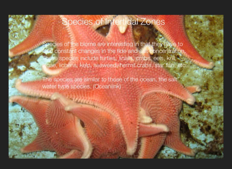 Species of the biome are interesting in that they have to face constant changes in the tide and salt concentration. These species include turtles, snails, crabs, eels, krill, algae, lichens, kelp, seaweed, hermit crabs, star fish, etc..