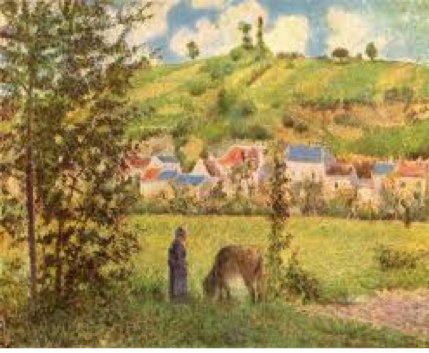 This painting by Camille Pissarro is an example of the human emotion happiness. You can see the obvious compound forms of houses and hills in the background, but the main focus is on the man or woman and their horse in the foreground. The many varying shapes of the painting are implied because of the texture made by the paintbrush. The countryside is way bigger in proportion to the two figures. This painting implies happiness because of the simplicity. It appears that the man is just taking in his surroundings on a morning stroll. First your focus is on the man and horse, but as his viewpoint goes to the hills, so does yours. The dark tree contrasts the other colors of the photo. The contrast between the tree and the rest of the picture brings unity to the painting. I think that this picture speaks happiness because the painter wants us to step away from our lives and see the little things in life as important too.