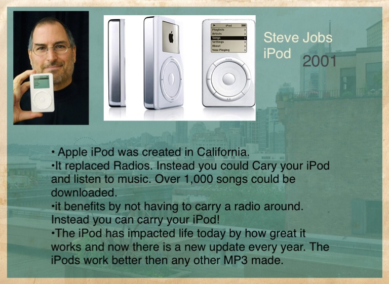 •The iPod has impacted life today by how great it works and now there is a new update every year. The iPods work better then any other MP3 made.