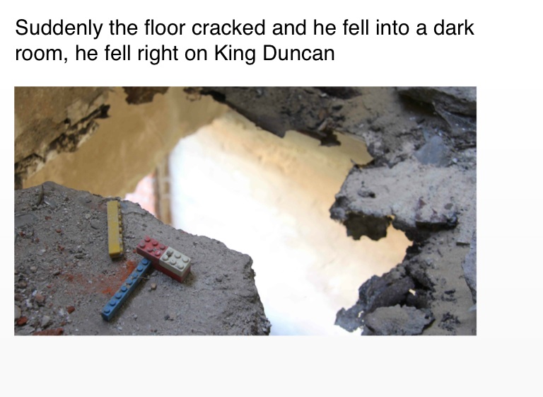 Suddenly the floor cracked and he fell into a dark room, he fell right on King Duncan