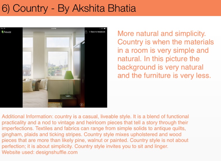 Additional Information: country is a casual, liveable style. It is a blend of functional practicality and a nod to vintage and heirloom pieces that tell a story through their imperfections. Textiles and fabrics can range from simple solids to antique quilts, gingham, plaids and ticking stripes. Country style mixes upholstered and wood pieces that are more than likely pine, walnut or painted. Country style is not about perfection; it is about simplicity. Country style invites you to sit and linger.